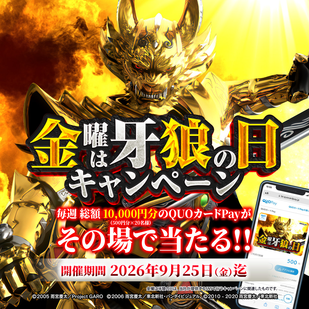 - 2026.04.07「e牙狼11~冴島大河~魔戒BURST Ver.」 オリジナルQUOカードPayが当たるアンケートを開催!!
